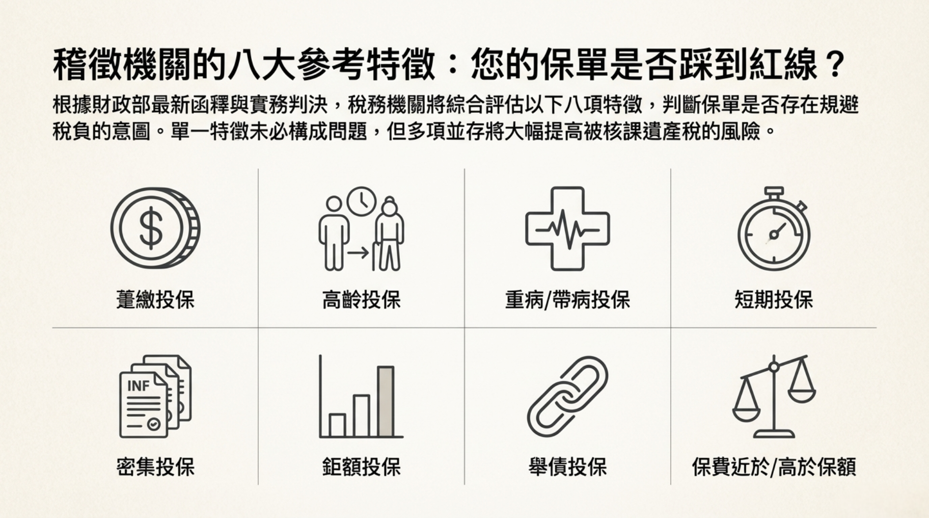 當保險規劃偏離其本質,過度著重於稅務效果時,反而更容易落入實質課稅的審查範圍,增加不必要的風險與成本。